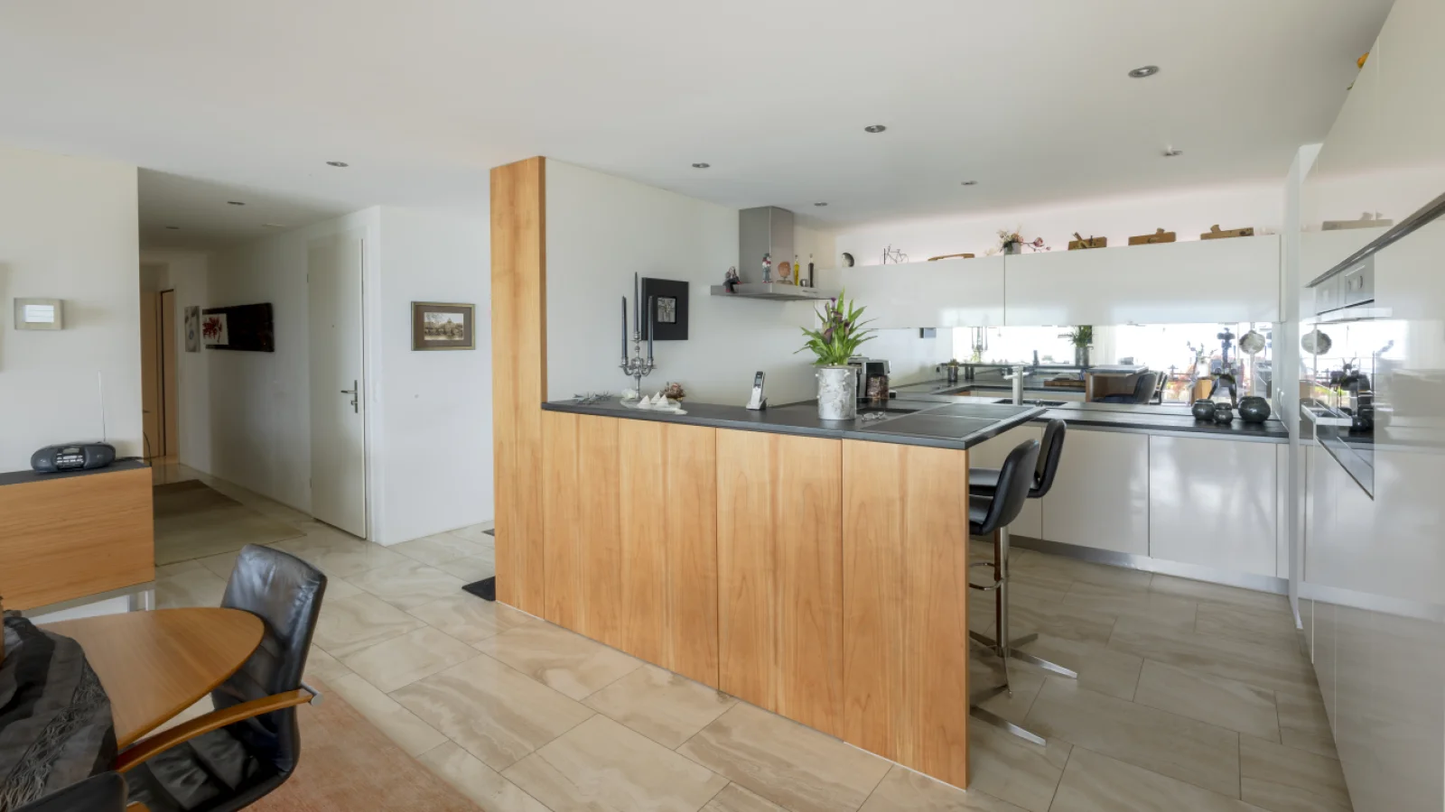 Topmoderne, neuwertige 3.5-Zimmer-Terrassenwohnung mit unverbaubarer Aussicht. An ruhiger und sonniger Lage mit 180° Panorama-Blick auf See und Berge.